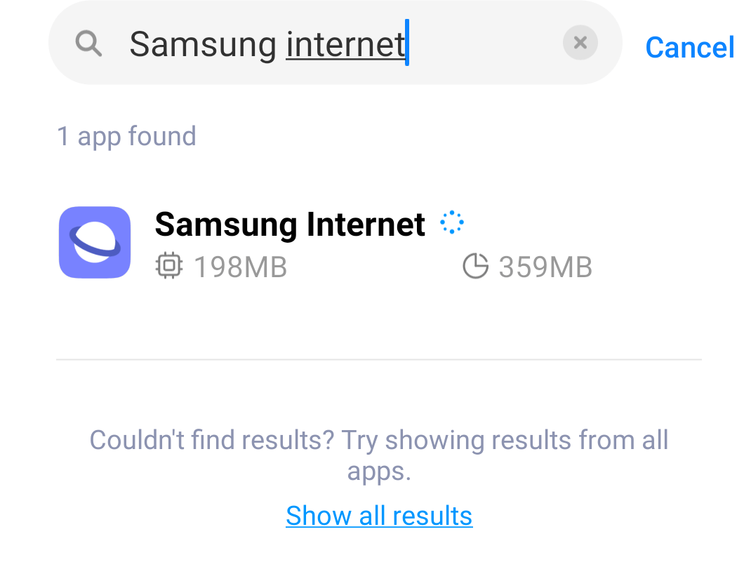 - 搜索Samsung Internet并点击它以打开应用程序信息页面。