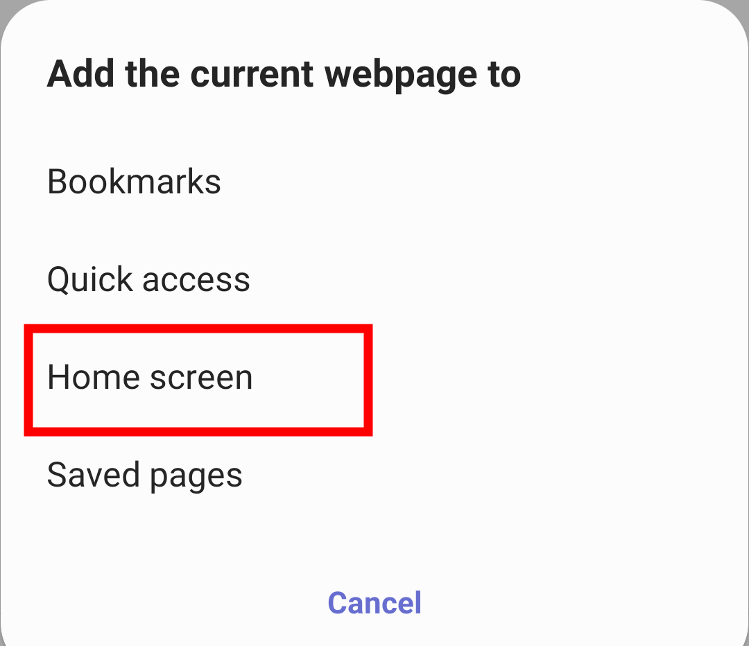这将显示您要添加当前网页的选项列表。 - 选择主屏幕选项。