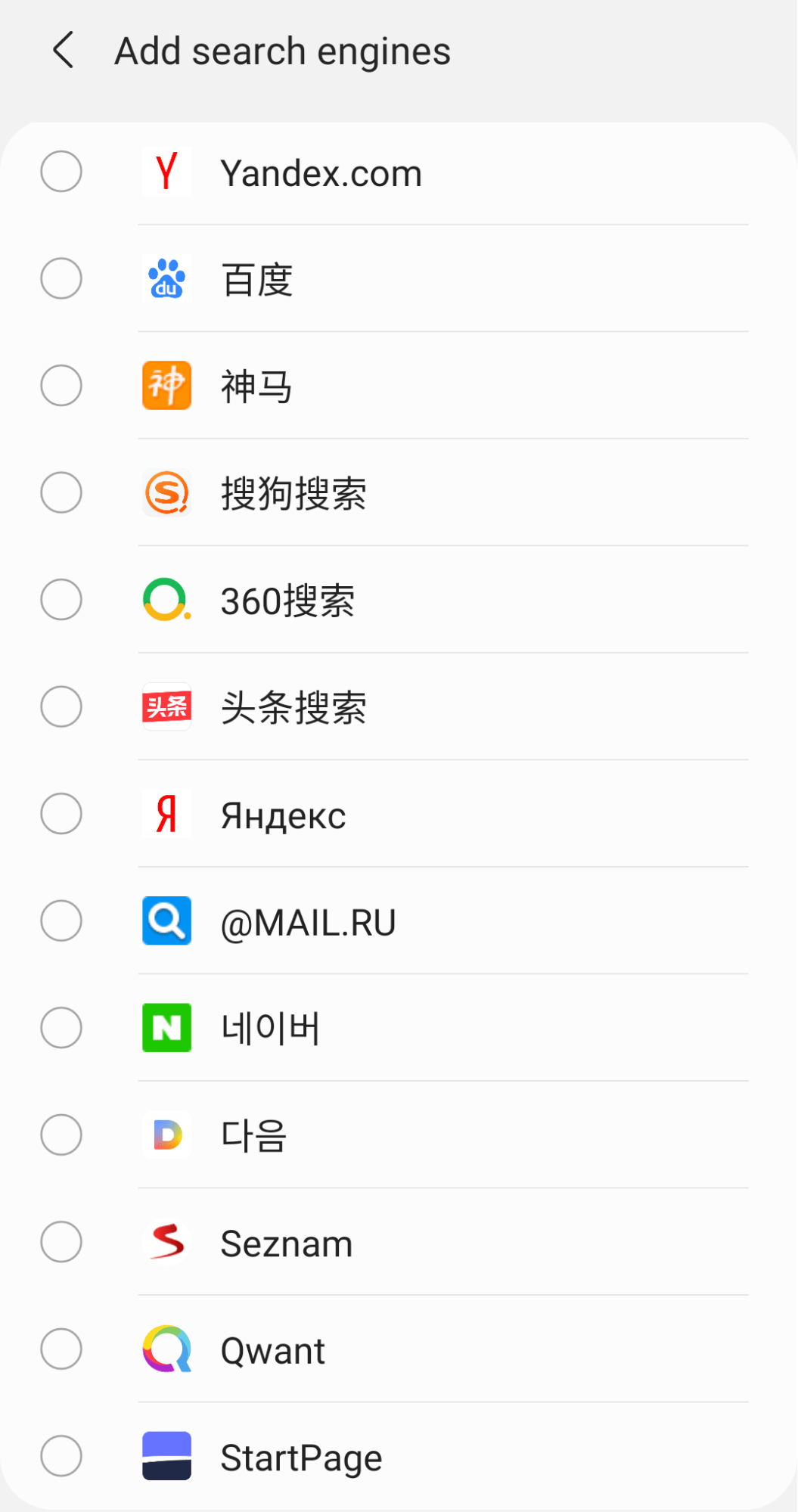 您可以选择任意搜索引擎或选择多个复选框添加到搜索引擎列表中,并使其成为三星 Internet 上的默认搜索引擎。