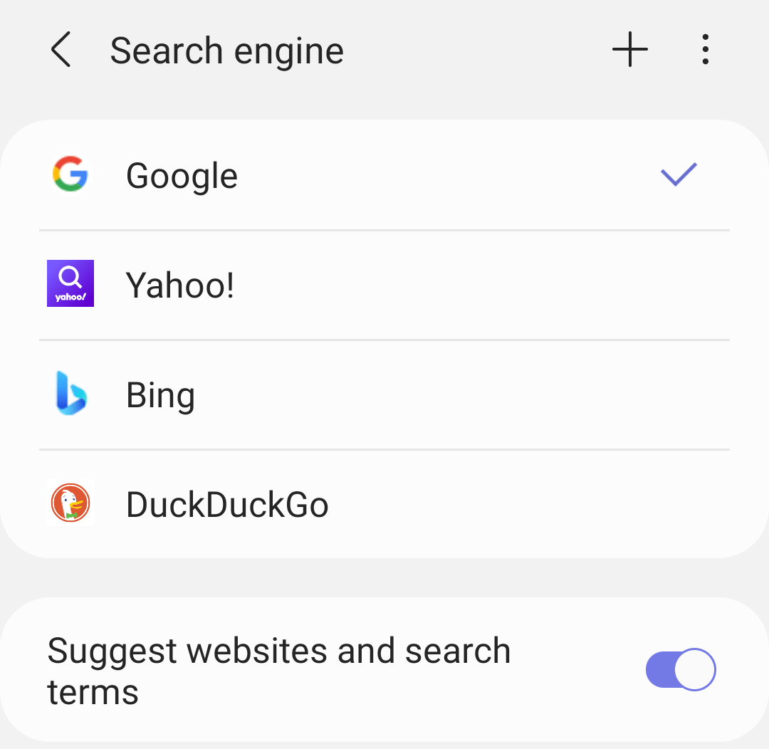 ,它将打开三星 Internet 上所有可用搜索引擎的广泛列表。您还可以启用或禁用切换按钮来建议网站和搜索词 进行个性化。