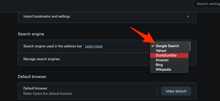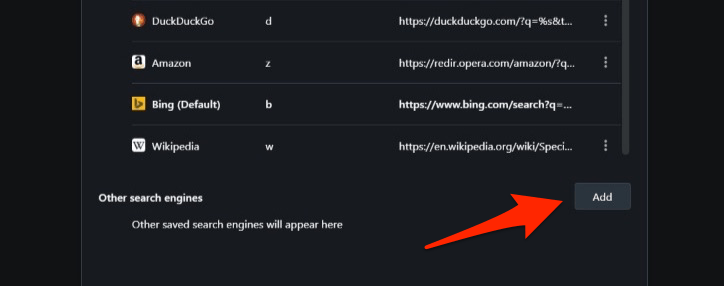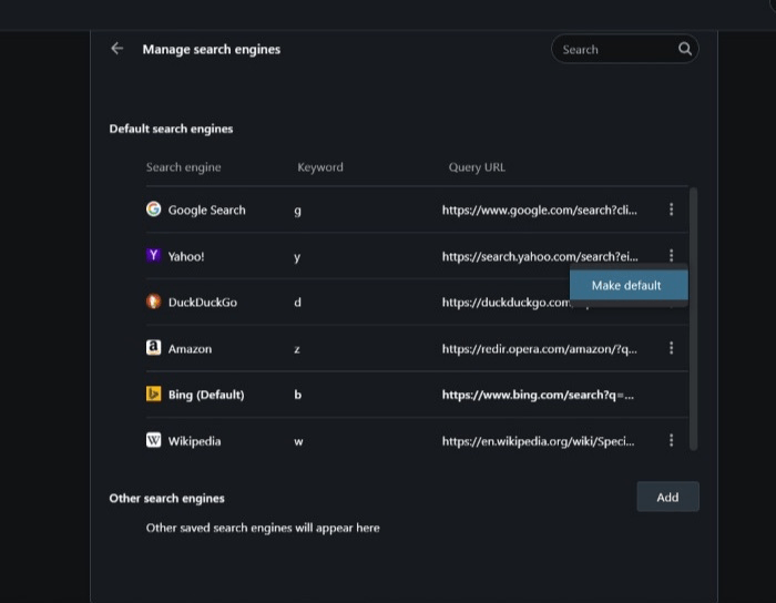 Opera 浏览器允许更改地址栏中使用的搜索引擎。您可以从谷歌、雅虎、必应、DuckDuckGo、亚马逊甚至维基百科等搜索引擎的预设列表中进行选择。Opera 浏览器还允许管理搜索引擎并从设置页面添加自定义搜索引擎。