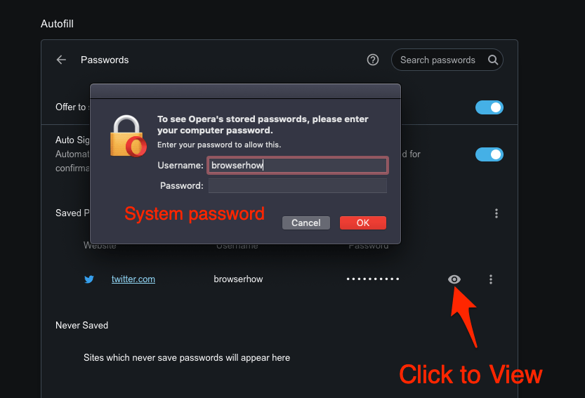 Opera 浏览器提供将密码和用户名保存在本地存储中的功能。它提供对保存密码的完整管理,例如编辑、删除和阻止站点提供保存密码。这是安全的,因为所有密码都存储在您的计算机中并受系统密码保护。