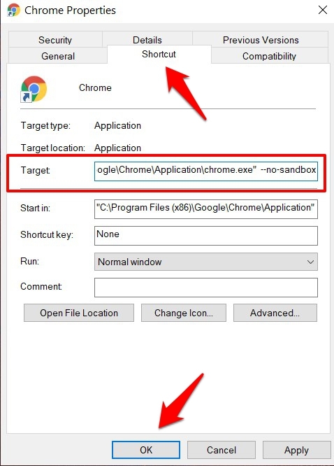 现在使用此快捷方式启动 Chrome,看看您是否可以访问所需的站点。此外,如果您想重新启用它,请从末尾删除–no-sandbox并保存更改。