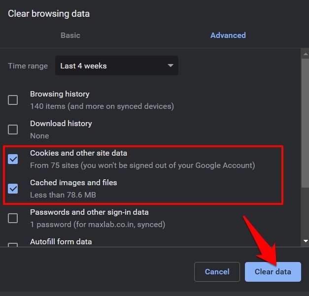 - 选择缓存的图像和文件以及Cookie 和其他站点数据。