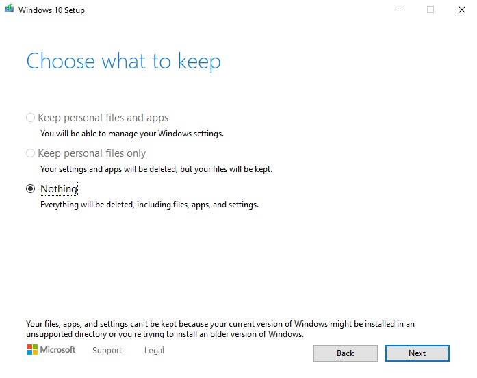 这意味着您只能选择第三个选项“ Nothing”。如果选择“ Nothing”,则意味着您无法通过保留个人文件来重新安装操作系统或就地升级Windows 10 20H2。