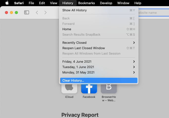 它将清除并清空 Safari 浏览器中存储的所有缓存文件。 - 接下来,单击菜单栏上的历史记录菜单。