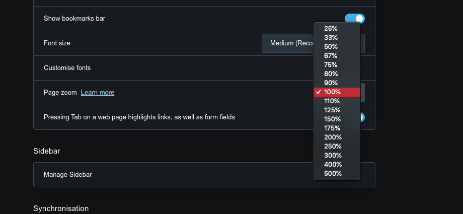 页面缩放对于不太容易满足默认分辨率并希望增加或减少它的用户来说是有益的。您可以选择将其增加至500%或将其减少至25%,默认设置为100%。