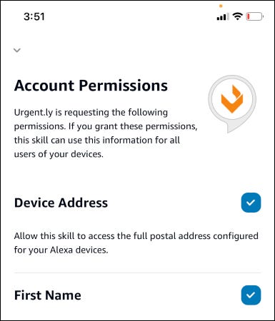 您还可以通过点击“授予 Urgent.ly 权限”,使用 Amazon Alexa 应用授予这些权限。
