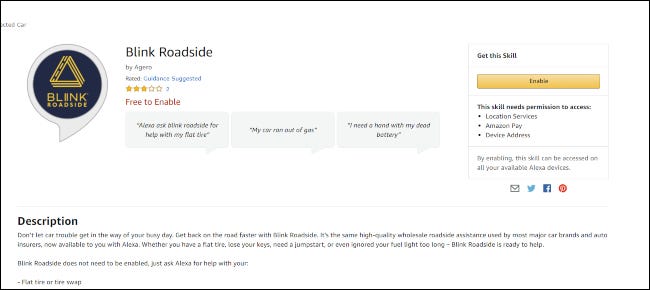 您可以通过访问Blink Roadside Alexa 技能页面并单击“启用”按钮来启用 Blink Roadside 技能。从那里,单击“管理权限”以允许应用程序应用定位服务、使用 Amazon Pay 并定位您设备的地址。