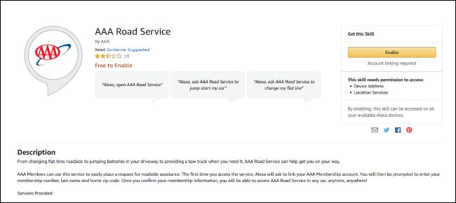 您可以通过访问AAA 道路服务 Alexa 技能页面并单击“启用”按钮来启用 AAA 道路服务技能。