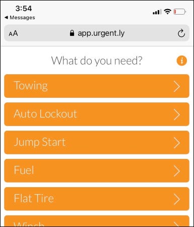 如果您拒绝,Urgent.ly 会询问您是否愿意接收短信链接以获取更多信息。点击链接将带您进入具有不同服务选项的菜单屏幕,包括牵引、自动锁定、快速启动和摩托车牵引。在要求您输入信用卡信息之前,单击其中任何一项都会提示您输入基本信息,例如您的姓名、电话号码、车辆品牌/型号和地址。