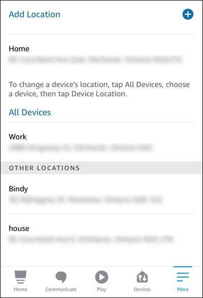 允许访问后,请确保您在 Alexa 应用程序中输入了您保存的地址。为此,请打开 Alexa 应用程序,然后点击屏幕底部的“更多”选项卡。接下来,选择“您的位置”,并填写您的家庭和工作地址。您还可以添加您经常访问的地点的其他地址。