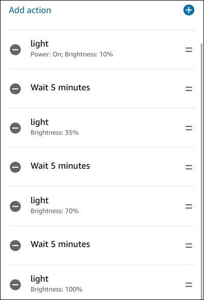 例如,假设您有可以使用 Alexa 设置为特定亮度的灯。您可以创建一个在您醒来之前开始的早晨例行程序,以便您的灯在低亮度下打开。然后,您可以为灯光添加多个动作,使其逐渐变亮至 100%。