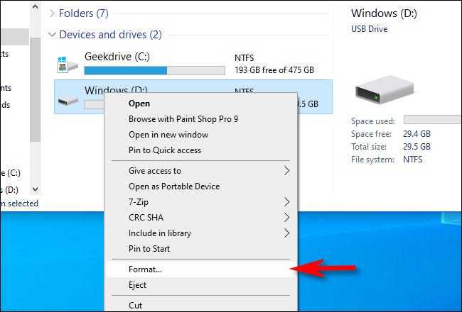 如果 Windows 识别出该驱动器,请打开文件资源管理器并导航到“此电脑”。在“设备和驱动器”列表中,右键单击要用作通用驱动器的 USB 驱动器,然后从列表中选择“格式化”。