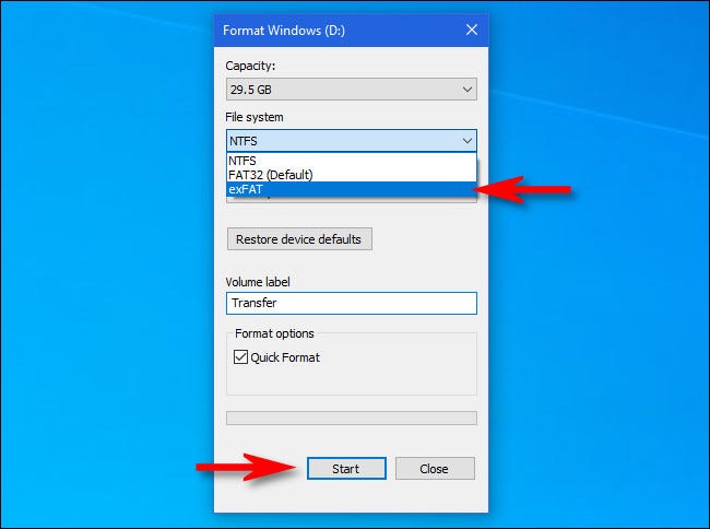 在出现的“格式”窗口中,单击标有“文件系统”的下拉框并选择“exFAT”。然后,在“卷标”框中键入驱动器的名称(如果您愿意)并单击“开始”。
