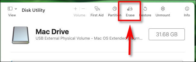 选择 USB 驱动器后,单击窗口顶部附近工具栏中的“擦除”。