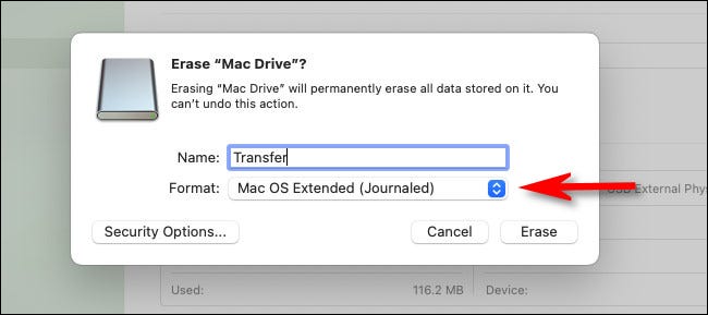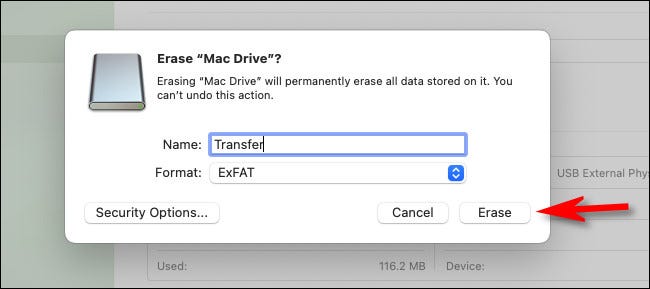 警告:在单击“擦除”之前,请确保您正在格式化的 USB 驱动器是空的或其中的数据已经备份。执行此步骤后,驱动器上的所有数据都将丢失。