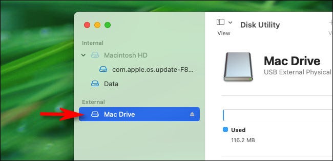 当“磁盘工具”打开时,查看“外部”部分中的边栏并选择您刚刚插入的 USB 驱动器。