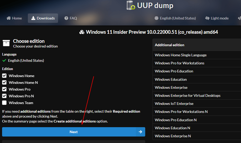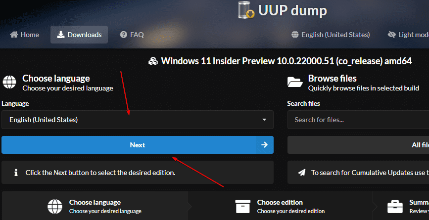 在UUP 转储的下一页上,您将从下拉框中看到一个选项“选择语言”。单击“下一步” 按钮后,选择您想要的 ISO 文件的语言。