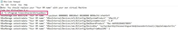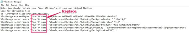 - 接下来,您需要粘贴剩余的行,但在此之前,您需要将“您的虚拟机名称”替换为您在 VirtualBox 中设置计算机时使用的名称。例如,在本例中为“macOS Big Sur”。替换后,复制/粘贴命令提示符中的所有剩余行,然后按“Enter”。