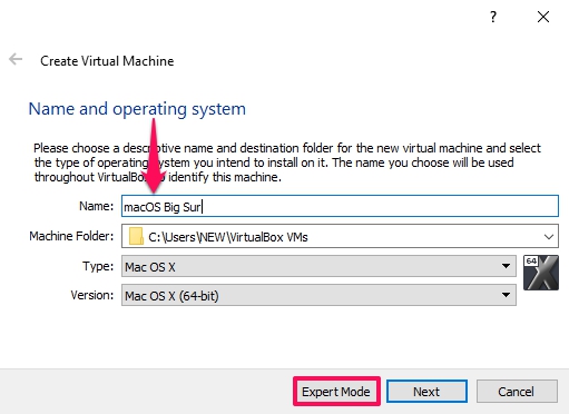 - 在这里,为您的虚拟机提供一个有效的名称。例如“macOS Big Sur”如下图。确保类型设置为 Mac OS X 并选择 64 位版本。完成后,单击“专家模式”继续下一步。