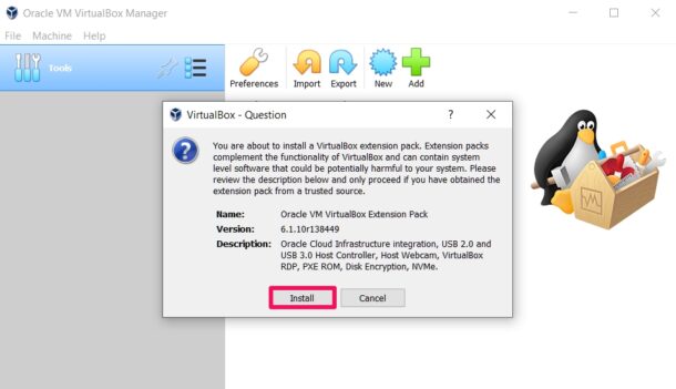 - 单击扩展包将在 Windows 上打开 VirtualBox,并弹出一个提示您安装的窗口。单击“安装”以完成此步骤。