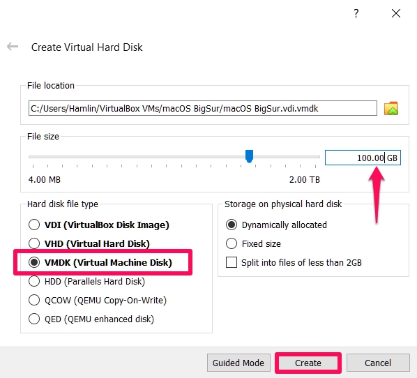 - 现在,使用滑块根据您的喜好设置虚拟硬盘大小。尽管这取决于您的计算机上有多少可用存储空间,但我们建议您为虚拟机分配 100 GB。硬盘文件类型选择“VMDK(虚拟机磁盘)”,点击“创建”。