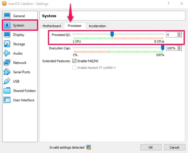 - 转到“系统”类别,然后单击顶部菜单中的“处理器”。您将能够使用滑块来调整处理器分配。建议为虚拟机分配处理器核心数的一半。请记住,如果您有一个 4 核/8 线程处理器,它将在 VirtualBox 中显示为 8 个 CPU 内核。在这种情况下,您可以为处理器分配设置 4 个内核。