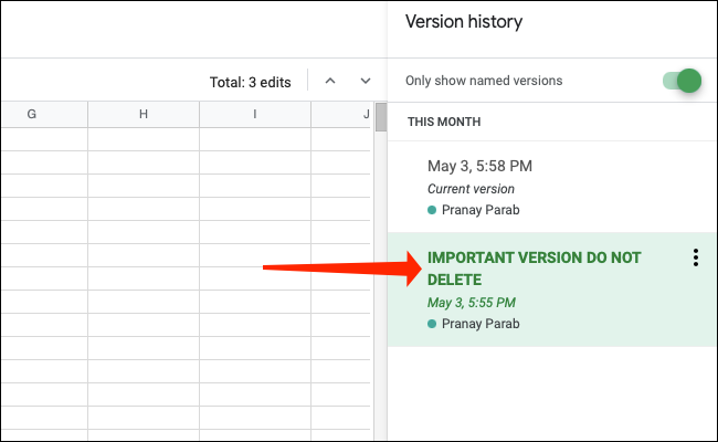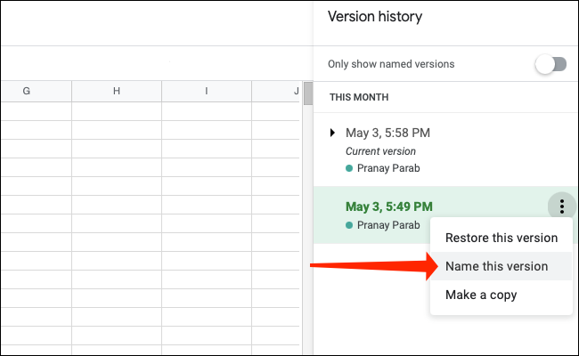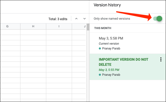 为此,请再次打开 Google 表格中的版本历史记录窗格。在此窗格的顶部,就在“版本历史记录”标签下方,您可以启用名为“仅显示命名版本”的选项。