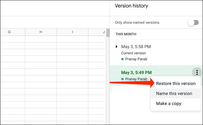 既然您已经找到了电子表格的版本历史记录并了解了如何命名版本,那么是时候了解如何在 Google 表格中恢复旧版本了。为此,请打开 Google 表格中的版本历史记录窗格,然后选择电子表格的正确版本。