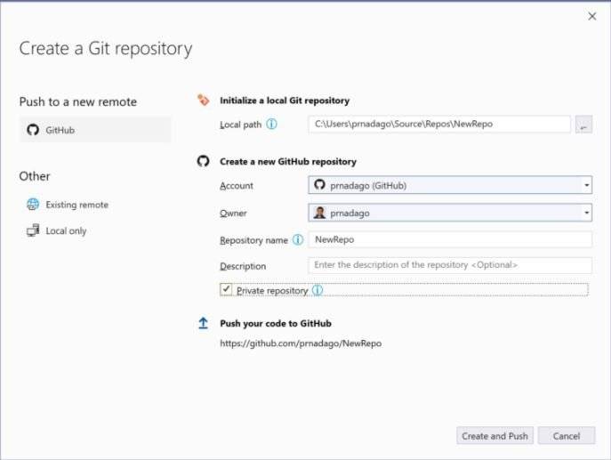 - 要开始使用Git,Visual Studio允许您单击一下即可将本地代码添加到Git和GitHub。“ 创建Git存储库” 对话框包含新的集成GitHub登录流程,类似于我们为Microsoft帐户提供的流程。
