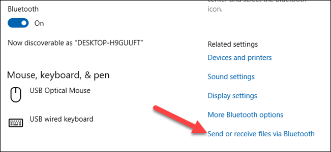 返回 Windows PC,再次打开“蓝牙和其他设备”设置菜单。这一次,单击“相关设置”侧栏中的“通过蓝牙发送或接收文件”。
