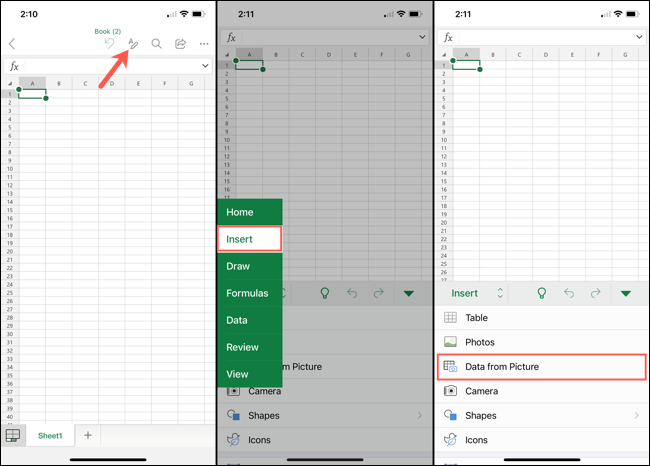 使用 Excel 的“来自图片的数据”功能插入数据有两种选择。第一种是使用设备的相机拍照。第二种是从您已经保存到设备的图像中插入数据。
