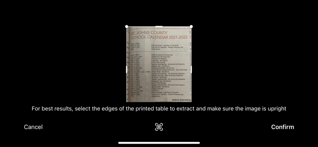 点击“图片中的数据”选项后,您的设备屏幕将转换为相机取景器。排列要捕获的表格。当您对拍摄感到满意时,点击底部的“快门”按钮即可拍摄照片。