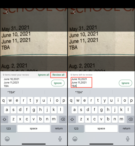要编辑数据,请点击文本框内部并进行更改。然后,点击“完成”。要接受数据而不进行更改,请点击“忽略”。