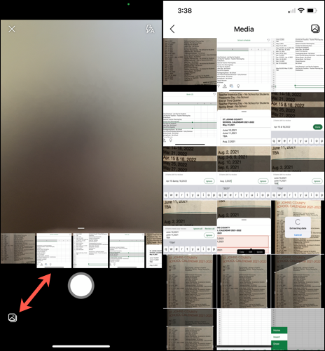 如果您已经拍摄了数据的照片或屏幕截图并将其保存到您的设备,则可以使用此选项。在取景器屏幕上,选择底部的已保存图像或点击媒体图标以添加更多照片。