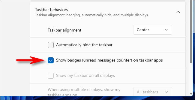 如果您厌倦了看到徽章,只需重新访问设置>个性化>任务栏>任务栏行为并取消选中“在任务栏应用程序上显示徽章(未读消息计数器)”以将其关闭。