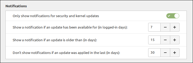 如果您想获得有关任何和所有更新的通知,请关闭“仅显示安全和内核更新的通知”。
