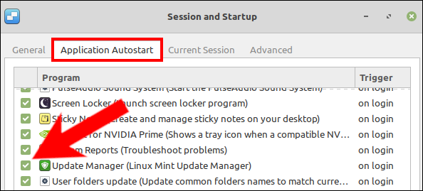 在会话和启动窗口中,单击“应用程序自动启动”选项卡并滚动,直到在应用程序列表中看到“更新管理器(Linux Mint 更新管理器)”。取消选中它。