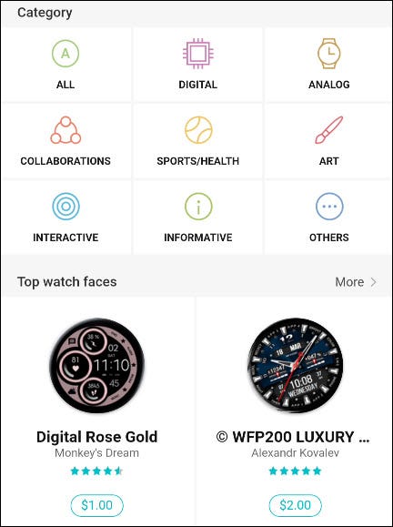 您将在屏幕顶部看到许多不同的类别可供探索。您可以向下滚动以浏览热门表盘。